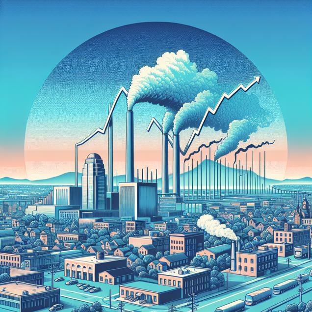 Prompt: [ Symbolism ] Generate an image of a calm and serene Paducah, Kentucky with a clear blue sky. Show a gradual decrease in the emission of smoke from vehicles and factories, while the cityscape reflects a sense of cleaner air. Simultaneously, depict the stock price ticker for Bristol-Myers Squibb with a clear downward trend, symbolizing the reduced demand for their allergy medications due to the improved air quality. The depiction should include only scenes, people, and objects, it should not include text or speech bubbles.