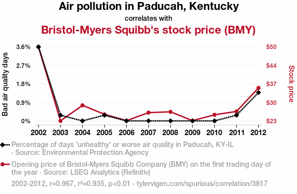- The spurious research paper: Peculiar Pollution: Paducah, Kentucky and the Perplexing Performance of Bristol-Myers Squibb's Stock Price