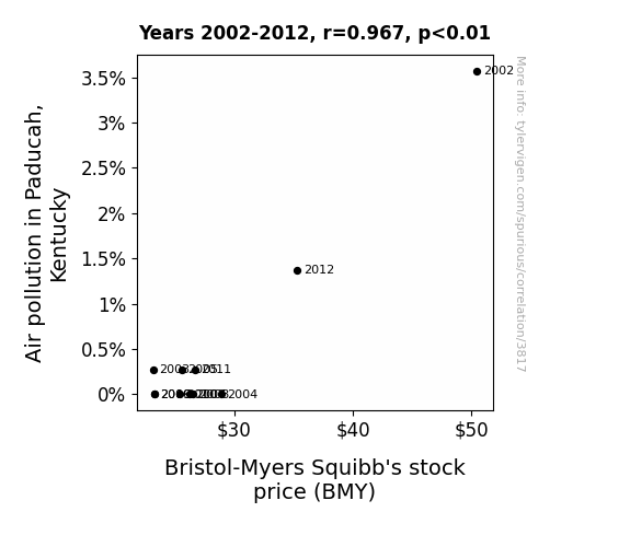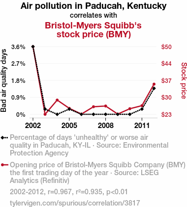 This means 93.5% of the change in the one variable (i.e., Bristol-Myers Squibb's stock price (BMY)) is predictable based on the change in the other (i.e., Air pollution in Paducah, Kentucky) over the 11 years from 2002 through 2012.