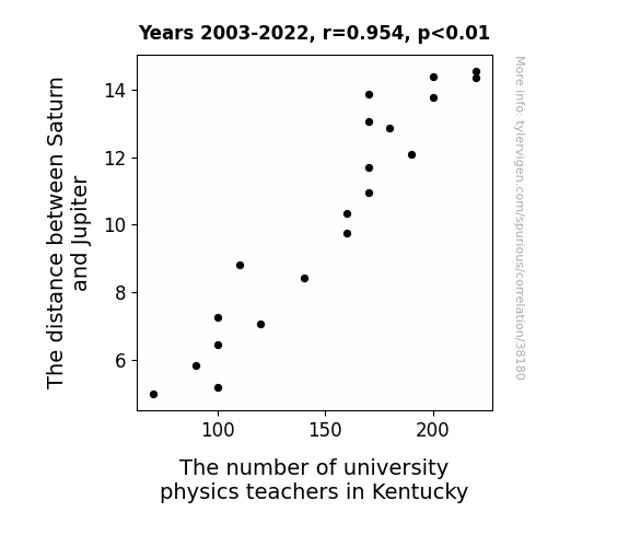This means 91.1% of the change in the one variable (i.e., The number of university physics teachers in Kentucky) is predictable based on the change in the other (i.e., The distance between Saturn and Jupiter) over the 20 years from 2003 through 2022.