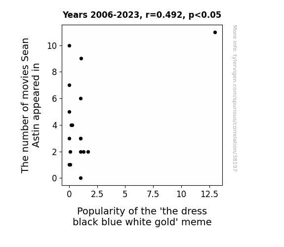 This means 24.2% of the change in the one variable (i.e., Popularity of the 'the dress black blue white gold' meme) is predictable based on the change in the other (i.e., The number of movies Sean Astin appeared in) over the 18 years from 2006 through 2023.