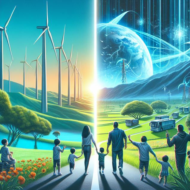 Prompt: Generate an image of a futuristic landscape split in two halves. On the left side, the bustling winds in Taiwan power wind turbines, providing renewable energy. The turbines stand tall and sleek against the backdrop of vibrant green hills. On the right side, in the US, several single fathers are seen tending to their children with love and dedication. The scene captures them joyfully engaging in various activities, symbolizing the rise of single father households. A subtle breeze carries the renewable energy from Taiwan to the US, visually connecting the two sides. As the breeze reaches the single fathers, it gently nudges them, infusing them with amplified masculine energy, inspiring them to embrace their paternal responsibilities with strength and grace. The depiction should include only scenes, people, and objects, it should not include text or speech bubbles.