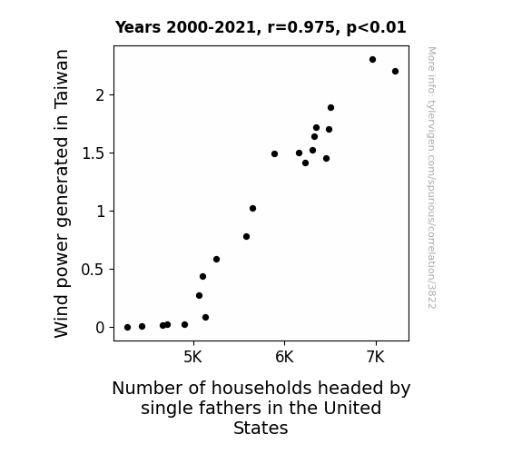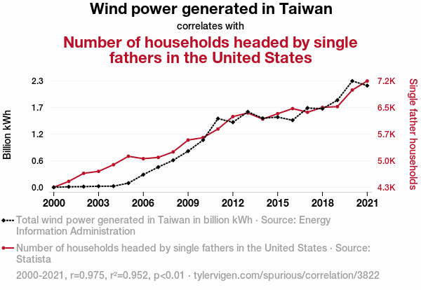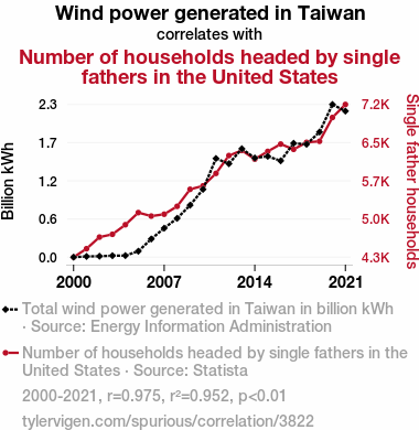 - The spurious research paper: Blowin' in the Wind: An Unconventional Connection Between Wind Power in Taiwan and Single Fathers in the United States