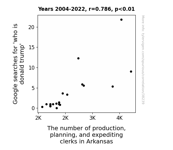 This means 61.8% of the change in the one variable (i.e., The number of production, planning, and expediting clerks in Arkansas) is predictable based on the change in the other (i.e., Google searches for 'who is donald trump') over the 19 years from 2004 through 2022.