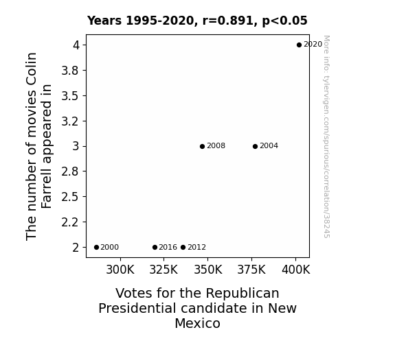 This means 79.3% of the change in the one variable (i.e., Votes for the Republican Presidential candidate in New Mexico) is predictable based on the change in the other (i.e., The number of movies Colin Farrell appeared in) over the 6 years from 1995 through 2020.