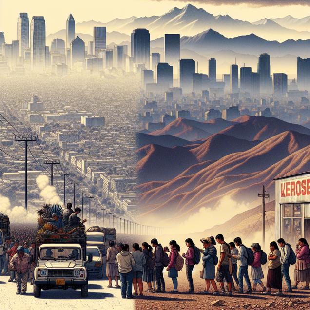 ChatGPT:  Create an image showcasing two contrasting scenes. In one part, depict Albuquerque with a thick layer of smog hanging in the air, obscuring buildings and mountains. Show people hurriedly packing their cars to escape, driving towards the clear, pristine mountains. In another part, depict Bolivia with a line of people outside a store with "Kerosene Sold Out" signs, scrambling to find fuel for their camping stoves. Keep the visual depiction clear and impactful without including any words or speech bubbles.