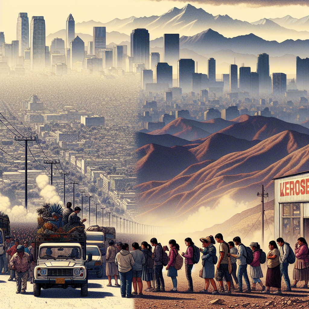 Prompt:  Create an image showcasing two contrasting scenes. In one part, depict Albuquerque with a thick layer of smog hanging in the air, obscuring buildings and mountains. Show people hurriedly packing their cars to escape, driving towards the clear, pristine mountains. In another part, depict Bolivia with a line of people outside a store with "Kerosene Sold Out" signs, scrambling to find fuel for their camping stoves. Keep the visual depiction clear and impactful without including any words or speech bubbles. The depiction should include only scenes, people, and objects, it should not include text or speech bubbles.