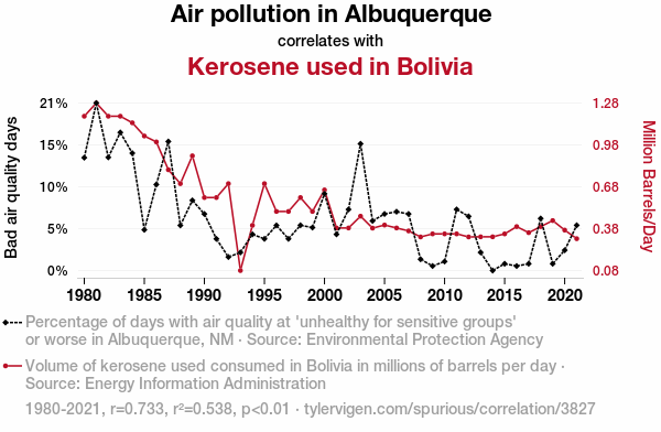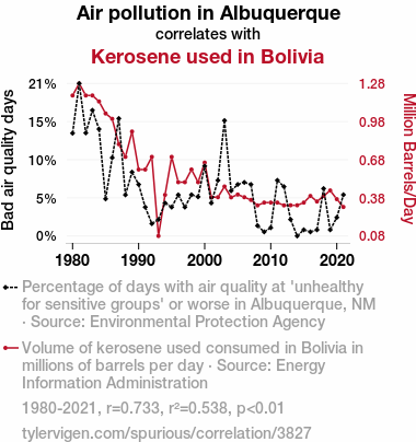 - The spurious research paper: In Pursuit of Pollution: The Parallels of Air Quality in Albuquerque and Kerosene Usage in Bolivia