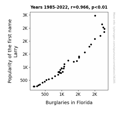 This means 93.4% of the change in the one variable (i.e., Burglaries in Florida) is predictable based on the change in the other (i.e., Popularity of the first name Larry) over the 38 years from 1985 through 2022.