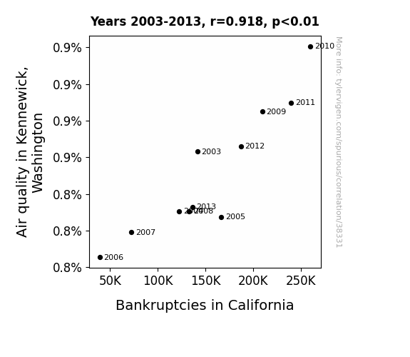 This means 84.4% of the change in the one variable (i.e., Bankruptcies in California) is predictable based on the change in the other (i.e., Air quality in Kennewick, Washington) over the 11 years from 2003 through 2013.