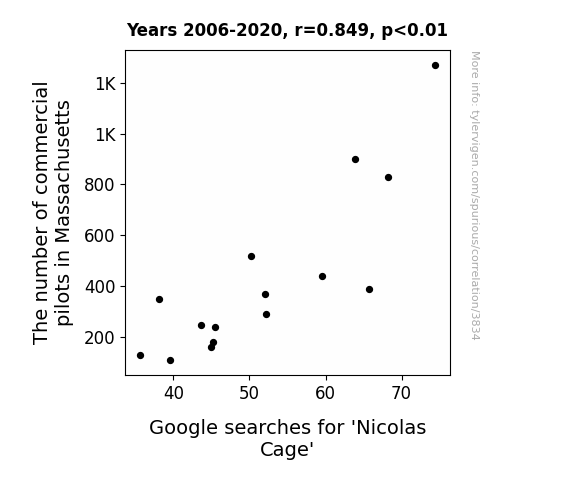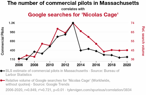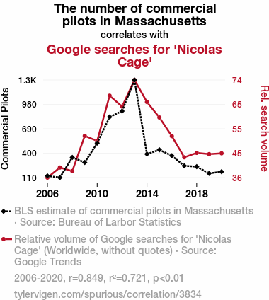 - The spurious research paper: Cage Match: The Aviatrix Dilemma - A Statistical Analysis of Commercial Pilots in Massachusetts and Google Searches for Nicolas Cage