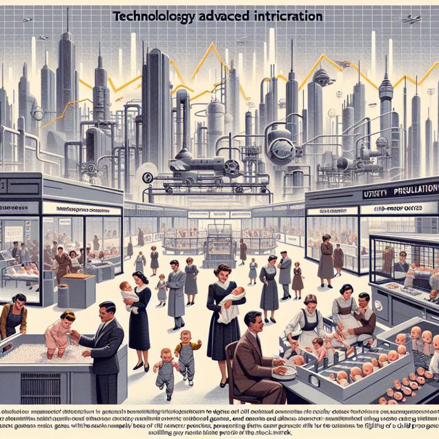 Prompt: Generate an image of a cybernetic art interpretation of a bustling nursery with futuristic elements. In the foreground, show proud parents watching as their babies take their first steps, with a subtle emphasis on the name "Walker". In the background, depict a futuristic factory setting where workers are assembling hi-tech baby gates at a rapid pace. Additionally, incorporate elements that symbolize the surge in demand, such as soaring stock market charts or futuristic indicators of popularity. Emphasize the juxtaposition of traditional parenting moments with the technological prowess that drives demand. The depiction should include only scenes, people, and objects, it should not include text or speech bubbles.