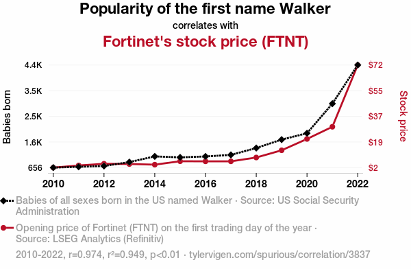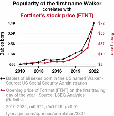 - The spurious research paper: Walkin' the Stock: The Correlation Between the Popularity of the Name Walker and Fortinet's Fortunes