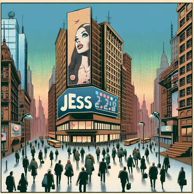 ChatGPT: Generate a comic-book-style illustration with a gritty, retro vibe reminiscent of the 1960s. Transport the viewer to a bustling city scene where a large billboard features the bold name "Jess" surrounded by a crowd of people wearing name tags that read "Jess." As time passes, the crowd slowly thins out, and the prominence of the billboard fades into the background. Concurrently, a digital stock ticker prominently displays the Lloyds Banking Group's stock price (LYG) gradually falling as the crowd of people named Jess diminishes. Ensure the illustration captures the essence of the city and evokes the distinct comic book style with muted colors and a dotted halftone pattern.