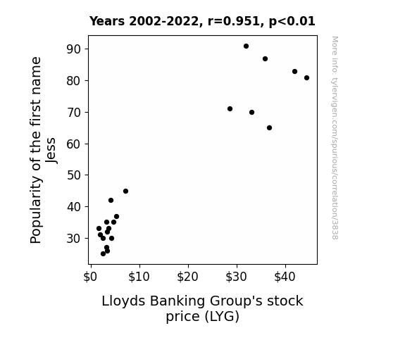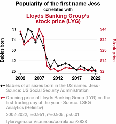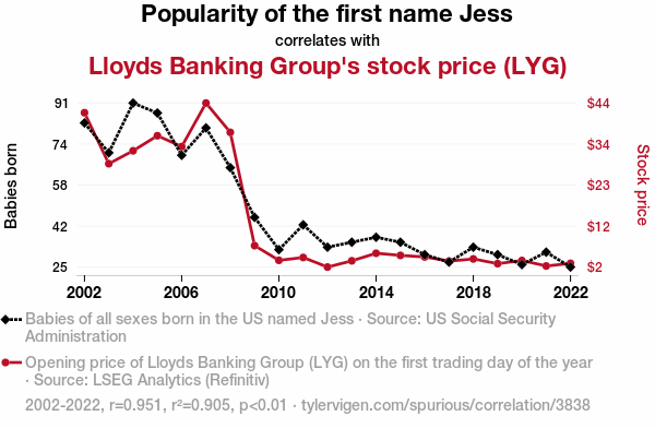 stock price, Lloyds Banking Group, correlation, popularity of name "Jess", US Social Security Administration, LSEG Analytics, Refinitiv, correlation coefficient, p-value, association, first name influence, financial institution, stock ticker, interconnectedness, unrelated phenomena