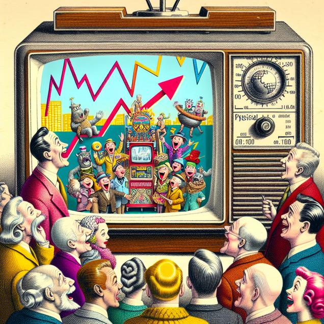 User prompt: Please respond with an image generation prompt that would be likely to create an interesting visual using DALLE-3, using the following style: [ Cutsy art illustration ] and depicting this scene: In the scene, we see a group of people gathered around a TV screen, all watching the show "Sex Education" with excitement. In the background, a stock market ticker is shown, with the TSM stock price rising steadily. The name "Maeve" appears on a name tag worn by one of the characters on the TV show, indicating a growing popularity of the name and its influence on the increased demand for electronic devices, driving up TSM's stock price. Keep the visual depiction simple. Do not include any words or speech bubbles.