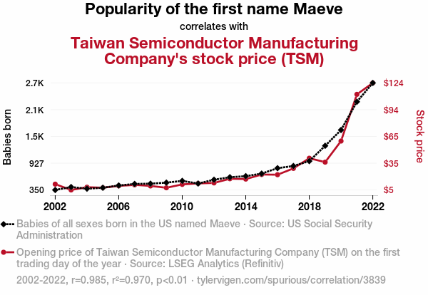 "Maeve influence on stock price," "Maeve name correlation with TSM stock," "TSM stock performance and name Maeve," "Social Security Administration data analysis," "LSEG Analytics correlation study," "Name influence on stock market behavior," "Unforeseen factors in financial markets," "First name impact on stock price," "Prevalence of name Maeve and TSM stock," "Stock price correlation with names," "Financial market research on name influence"
