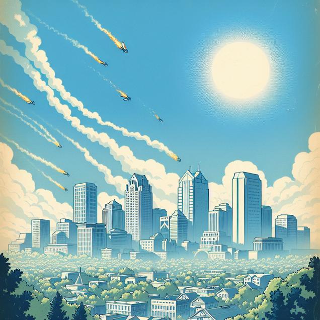 User prompt: Please respond with an image generation prompt that would be likely to create an interesting visual using DALLE-3, using the following style: [ A Discovery magazine cover image ] and depicting this scene: In Sacramento, as the air quality improved, the skyline was clear and bright. There were no plumes of smoke from the burning buildings, and the arsonists found it difficult to find suitable cover for their actions. With the clean air, the arsonists could no longer rely on the smoke to blend in, so they reduced their attempts to burn down buildings, and instead enjoyed the fresh, cool breeze under the blue sky. Keep the visual depiction simple. Do not include any words or speech bubbles.