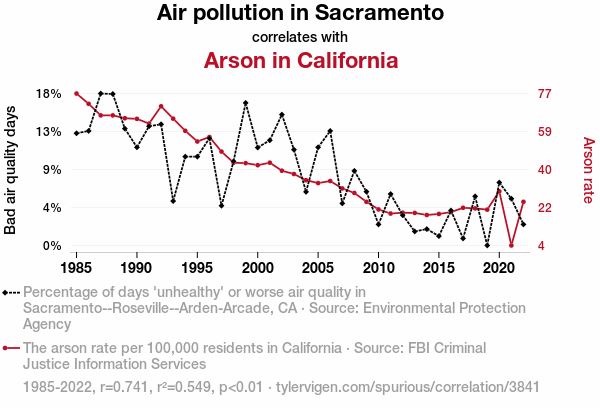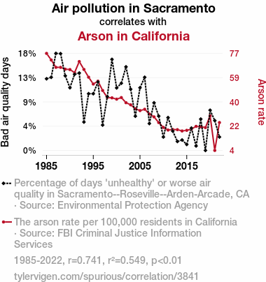 - The spurious research paper: Fanning the Flames: A Smokin' Hot Analysis of the Relationship Between Air Pollution in Sacramento and Arson in California