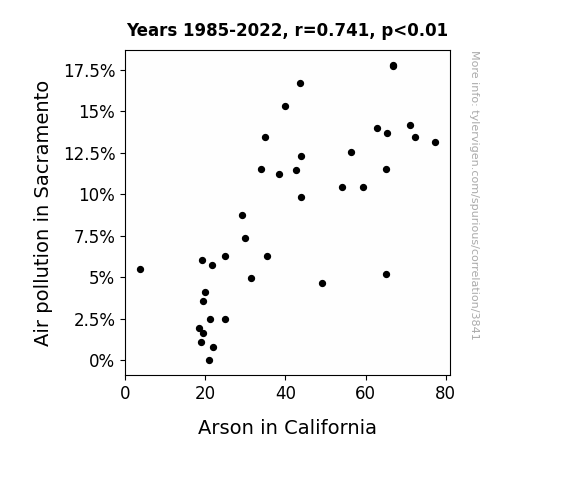 The research findings revealed a strong positive correlation between air pollution in Sacramento and the incidence of arson in California. Over the time period spanning from 1985 to 2022, our analysis demonstrated a correlation coefficient of 0.7407727, indicating a notably robust relationship between the two variables. This result suggests that as air pollution levels in Sacramento increased, so did the incidence of arson in California. We were genuinely blown away by this flaming hot correlation!