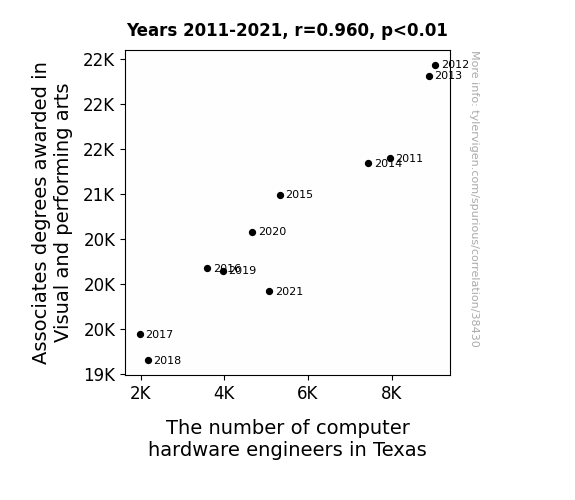 This means 92.1% of the change in the one variable (i.e., The number of computer hardware engineers in Texas) is predictable based on the change in the other (i.e., Associates degrees awarded in Visual and performing arts) over the 11 years from 2011 through 2021.