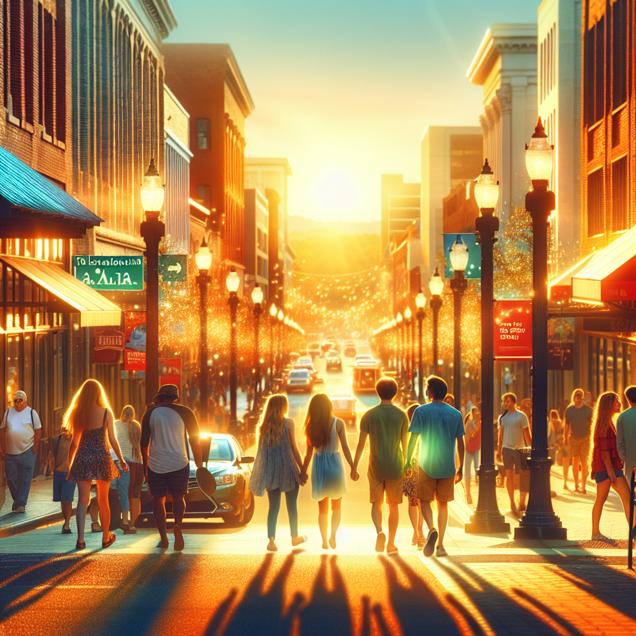 ChatGPT: Generating prompt for DALL·E-3: Create an image of a serene, sunlit street scene in Tuscaloosa, Alabama, showcasing couples walking hand in hand as vibrant sunlight bathes the landscape. The clean, pollution-free air allows for unobstructed views of the city's beautiful scenery, promoting openness and fostering healthy relationships. The emphasis should be on the clear, bright atmosphere and the relaxed, joyful interactions between the couples.
