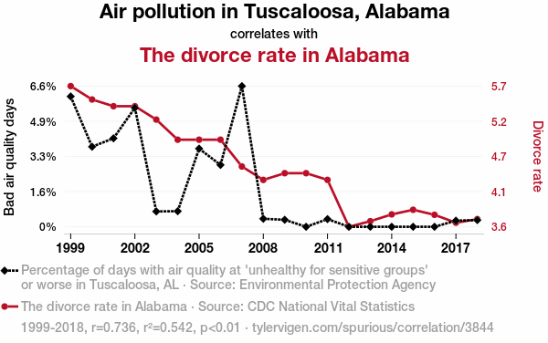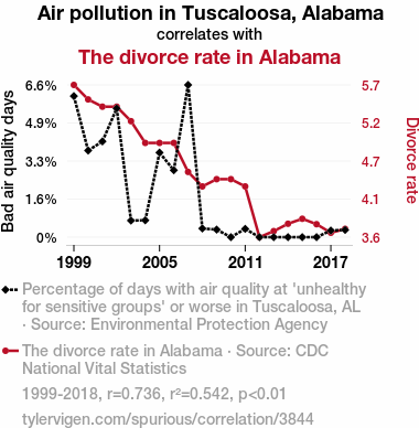 - The spurious research paper: Airborne Afflictions: An Assessment of the Correlation Between Air Pollution in Tuscaloosa, Alabama and the Divorce Rate in Alabama