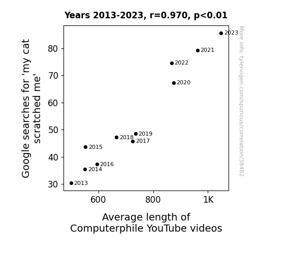 This means 94.2% of the change in the one variable (i.e., Average length of Computerphile YouTube videos) is predictable based on the change in the other (i.e., Google searches for 'my cat scratched me') over the 11 years from 2013 through 2023.