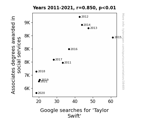 This means 72.3% of the change in the one variable (i.e., Google searches for 'Taylor Swift') is predictable based on the change in the other (i.e., Associates degrees awarded in social services) over the 11 years from 2011 through 2021.
