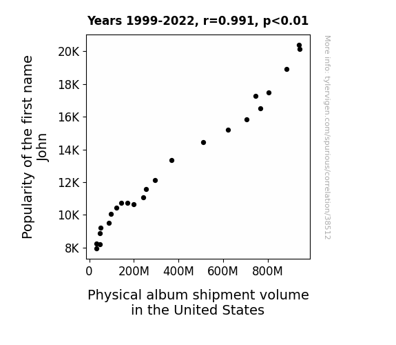 This means 98.2% of the change in the one variable (i.e., Physical album shipment volume in the United States) is predictable based on the change in the other (i.e., Popularity of the first name John) over the 24 years from 1999 through 2022.