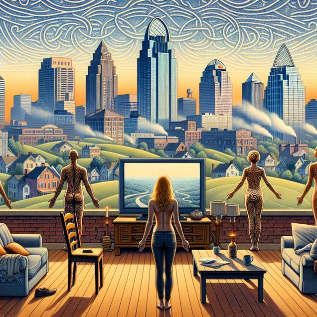 ChatGPT: The skyline of Cincinnati is visible and clear, with only a hint of smog lingering in the air. People in the city are seen taking deep breaths and looking around with a newfound clarity. Meanwhile, a television in a living room shows a dwindling number of viewers watching Days of Our Lives, as the once crowded sofa is now empty.