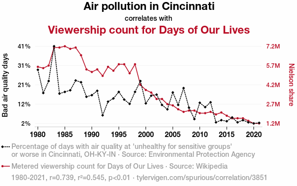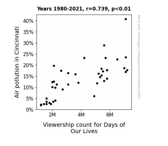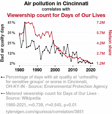 - The spurious research paper: Correlated Cincinnati Air Contaminants and Coruscating Counts of Days of Our Lives: A Comprehensive Coefficient Comparison