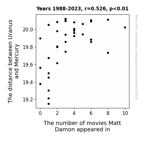 This means 27.6% of the change in the one variable (i.e., The number of movies Matt Damon appeared in) is predictable based on the change in the other (i.e., The distance between Uranus and Mercury) over the 36 years from 1988 through 2023.