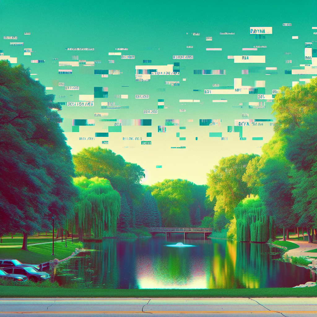 ChatGPT: Create an image that features a glitched representation of a serene park scene in Milwaukee. In the background, there are lush green trees and a serene pond. The park is empty except for a few scattered cars, with their license plates visibly glitched to only display the name "Dayna." In the air above, glitched particles clear the once-polluted atmosphere, depicting the reduction in air pollution resulting from the phenomenon.