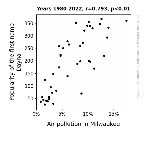 Dayna, name popularity, air pollution, Milwaukee, correlation, US Social Security Administration, Environmental Protection Agency, correlation coefficient, statistical significance, baby naming trends, atmospheric conditions, empirical absurdity, human nomenclature, environmental impact