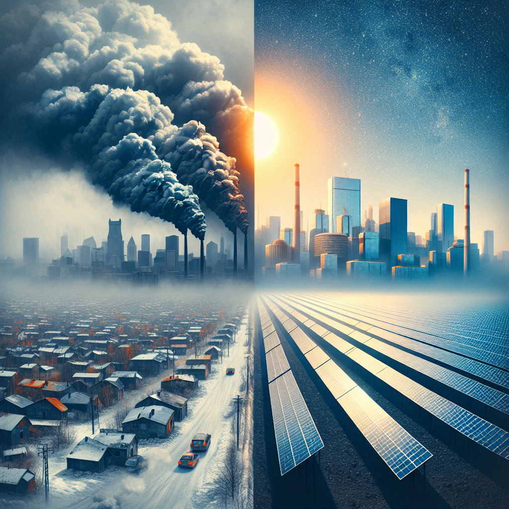 ChatGPT: Generate an image in the style of scalar art that contrasts the urban pollution of Duluth's hazy skyline with the clean energy production in Gabon. Show a cityscape of Duluth wrapped in thick smog and dark industrial chimneys, juxtaposed with a bright scene in Gabon where a vast solar power plant basks in the sun, with rows of glimmering solar panels. Depict the stark contrast between pollution and renewable energy in these two locations with bold, contrasting visual elements.