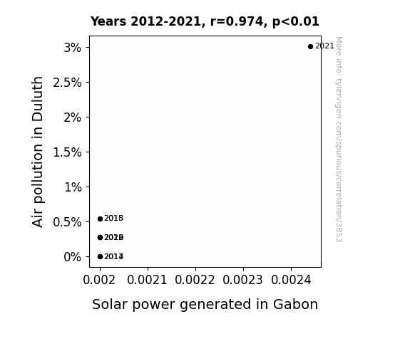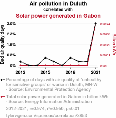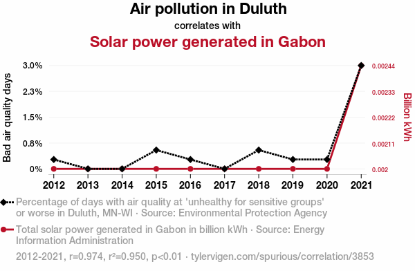 This means 95% of the change in the one variable (i.e., Solar power generated in Gabon) is predictable based on the change in the other (i.e., Air pollution in Duluth) over the 10 years from 2012 through 2021.