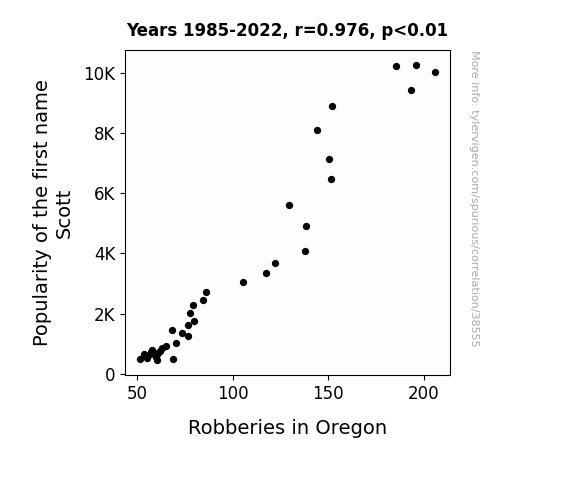 This means 95.2% of the change in the one variable (i.e., Robberies in Oregon) is predictable based on the change in the other (i.e., Popularity of the first name Scott) over the 38 years from 1985 through 2022.