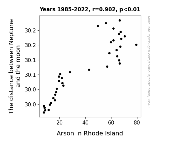 This means 81.4% of the change in the one variable (i.e., Arson in Rhode Island) is predictable based on the change in the other (i.e., The distance between Neptune and the moon) over the 38 years from 1985 through 2022.