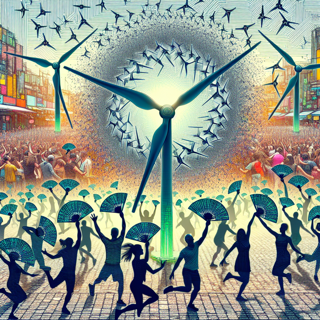 Prompt: Generate an image of a vibrant cyber folk scene in a bustling square. A multitude of people are gathered, each energetically waving a hand-held fan emblazoned with the name Brielle. The fans create a whirl of wind, depicted by the wind turbines in the Falkland Islands spinning faster and generating a significant amount of wind power. This imagery should capture the dynamic movement and energy of the people and the environmental impact of the wind power in a visually striking manner. The depiction should include only scenes, people, and objects, it should not include text or speech bubbles.