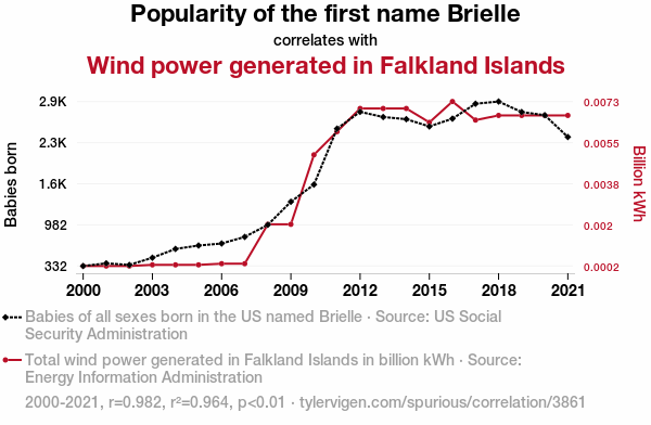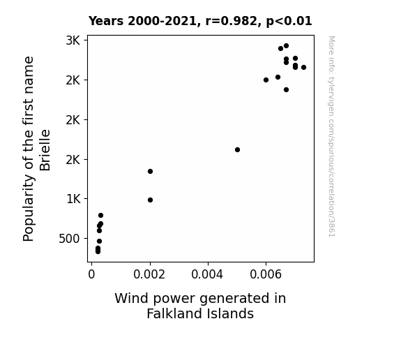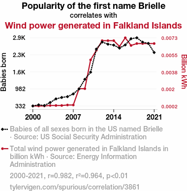 It turns out that the more babies named Brielle, the more wind power generated in the Falkland Islands. It seems that we have a "gust" of popularity driving renewable energy!