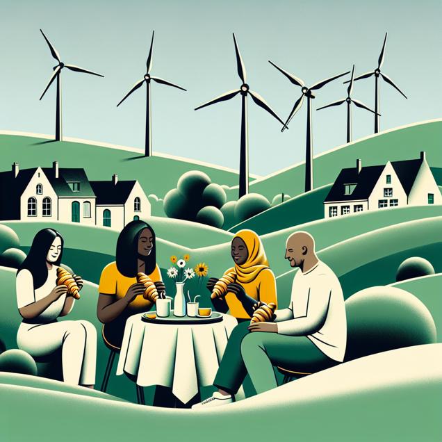 ChatGPT: Generate an image of a serene Belgian town with minimalist elements. Show a small group of people savoring freshly baked croissants while sitting on a lush green hill. In the background, depict a line of elegant wind turbines gracefully spinning to generate clean energy, which offsets the emissions caused by dairy consumption. Emphasize the tranquility of the scene and use simple, clean lines to capture the essence of the setting.