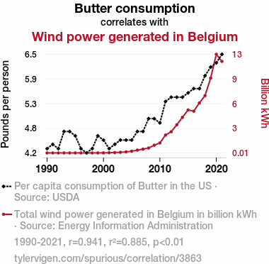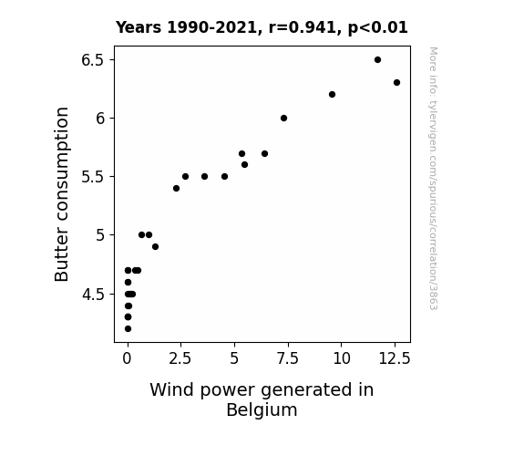 This means 88.5% of the change in the one variable (i.e., Wind power generated in Belgium) is predictable based on the change in the other (i.e., Butter consumption) over the 32 years from 1990 through 2021.