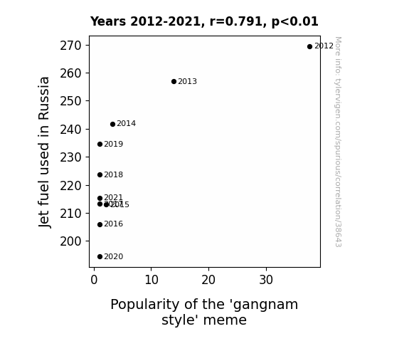 This means 62.6% of the change in the one variable (i.e., Popularity of the 'gangnam style' meme) is predictable based on the change in the other (i.e., Jet fuel used in Russia) over the 10 years from 2012 through 2021.