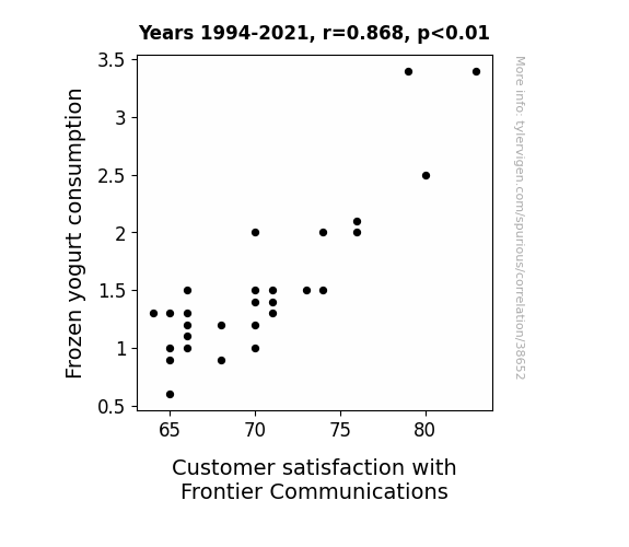This means 75.3% of the change in the one variable (i.e., Customer satisfaction with Frontier Communications) is predictable based on the change in the other (i.e., Frozen yogurt consumption) over the 28 years from 1994 through 2021.