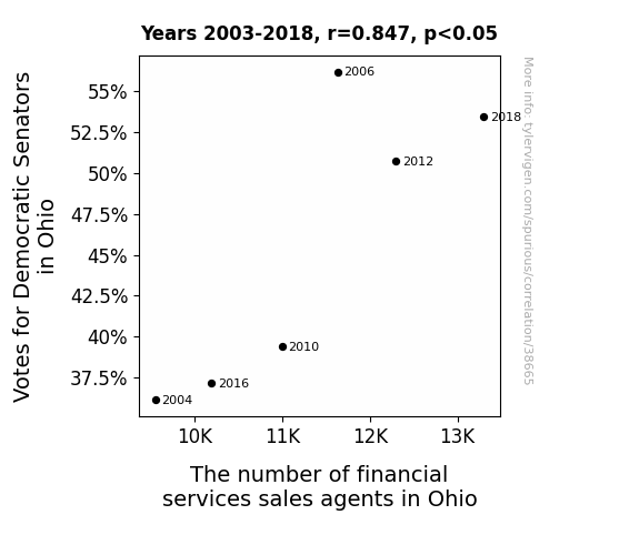 This means 71.7% of the change in the one variable (i.e., The number of financial services sales agents in Ohio) is predictable based on the change in the other (i.e., Votes for Democratic Senators in Ohio) over the 6 years from 2003 through 2018.