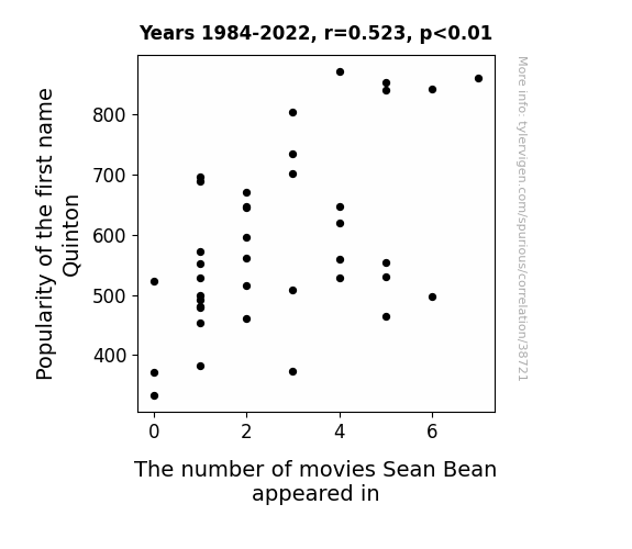This means 27.3% of the change in the one variable (i.e., The number of movies Sean Bean appeared in) is predictable based on the change in the other (i.e., Popularity of the first name Quinton) over the 39 years from 1984 through 2022.
