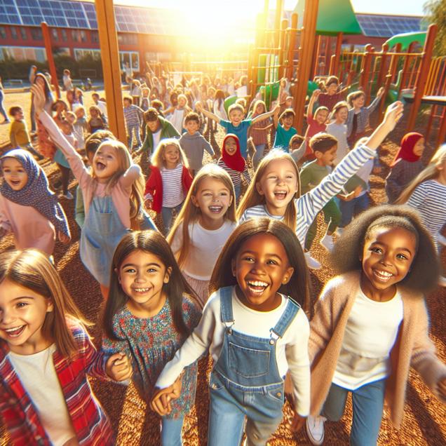 Prompt: [A photo-realistic image] Imagine a vibrant playground teeming with energy as groups of children delight in play and laughter. Amid the laughter, several little girls named Maeve engage in joyous activities. The sunlight grows more intense, causing nearby solar panels to radiate a brilliant glow, providing a substantial influx of solar power for the community of Hungary. The depiction should include only scenes, people, and objects, it should not include text or speech bubbles.