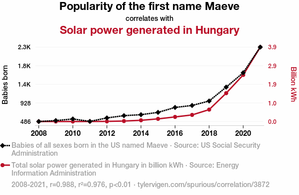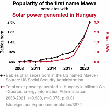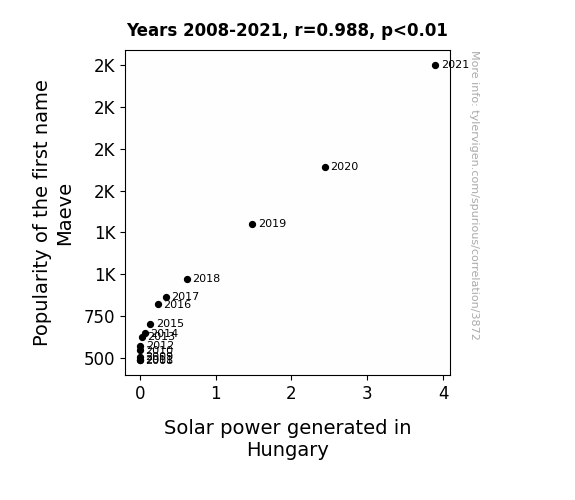 This means 97.6% of the change in the one variable (i.e., Solar power generated in Hungary) is predictable based on the change in the other (i.e., Popularity of the first name Maeve) over the 14 years from 2008 through 2021.