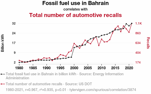 This means 93.5% of the change in the one variable (i.e., Total number of automotive recalls) is predictable based on the change in the other (i.e., Fossil fuel use in Bahrain) over the 42 years from 1980 through 2021.